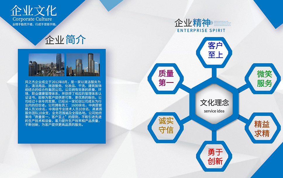 公司是一家以清潔服務(wù)為主,旅游,干洗、化妝品、裝修和餐飲相結(jié)合的多元化發(fā)展運(yùn)營的服務(wù)性企業(yè)。企業(yè)本著誠信第一、服務(wù)至上的原則,依靠公司盡我所能、力我所及的信條從2012年到現(xiàn)在服務(wù)了多家企業(yè),現(xiàn)在我們已經(jīng)擁有了400家左右的清潔服務(wù)項(xiàng)目和多家洗衣店。我們會一直牢記服務(wù),創(chuàng)新才是我們企業(yè)發(fā)展的服務(wù)宗旨。